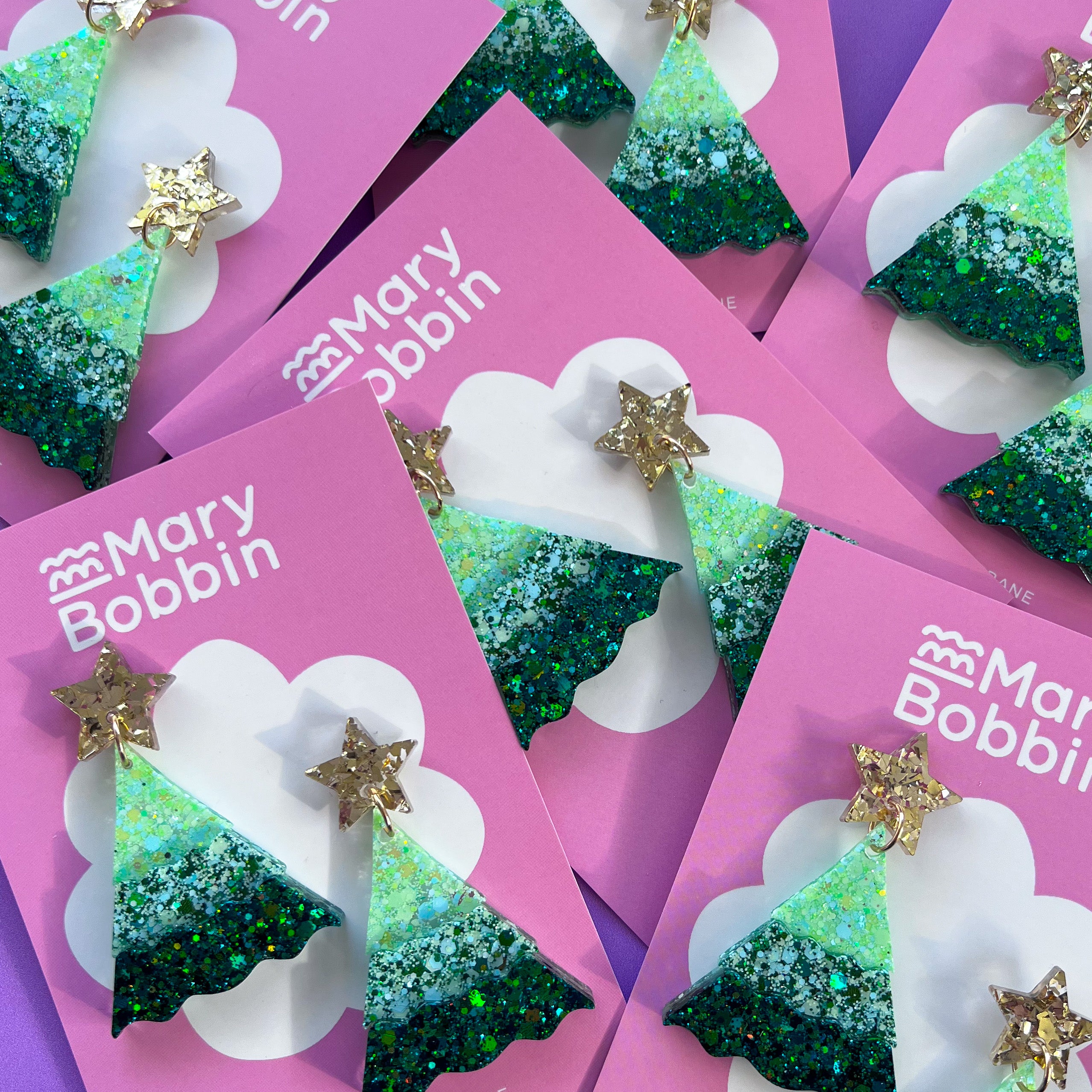 Construction: layered, 3-dimensional hand-poured resin Christmas trees featuring multi-layers of our unique glitter mixes. Finished off with a a gold foil acrylic star stud-topper.